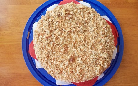 První placku pomažte krémem, položte druhou placku, opět pomažte krémem, dokud nespotřebujete všechny placky. Na závěr pomažte krémem celý dort. Odkrojené části z placek rozdrobte a posypte jimi ze všech stran celý dort.